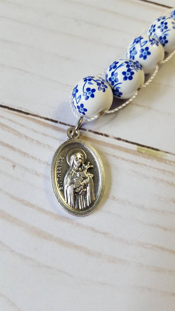 Set of ceramic sacrifice beads with blue flowers, modeled after those used by St. Therese of Lisieux to count little acts of kindness or little sacrifices made for love of others throughout the day. Keep the beads in your pocket and each time you offer something up, move a bead towards the Crucifix.