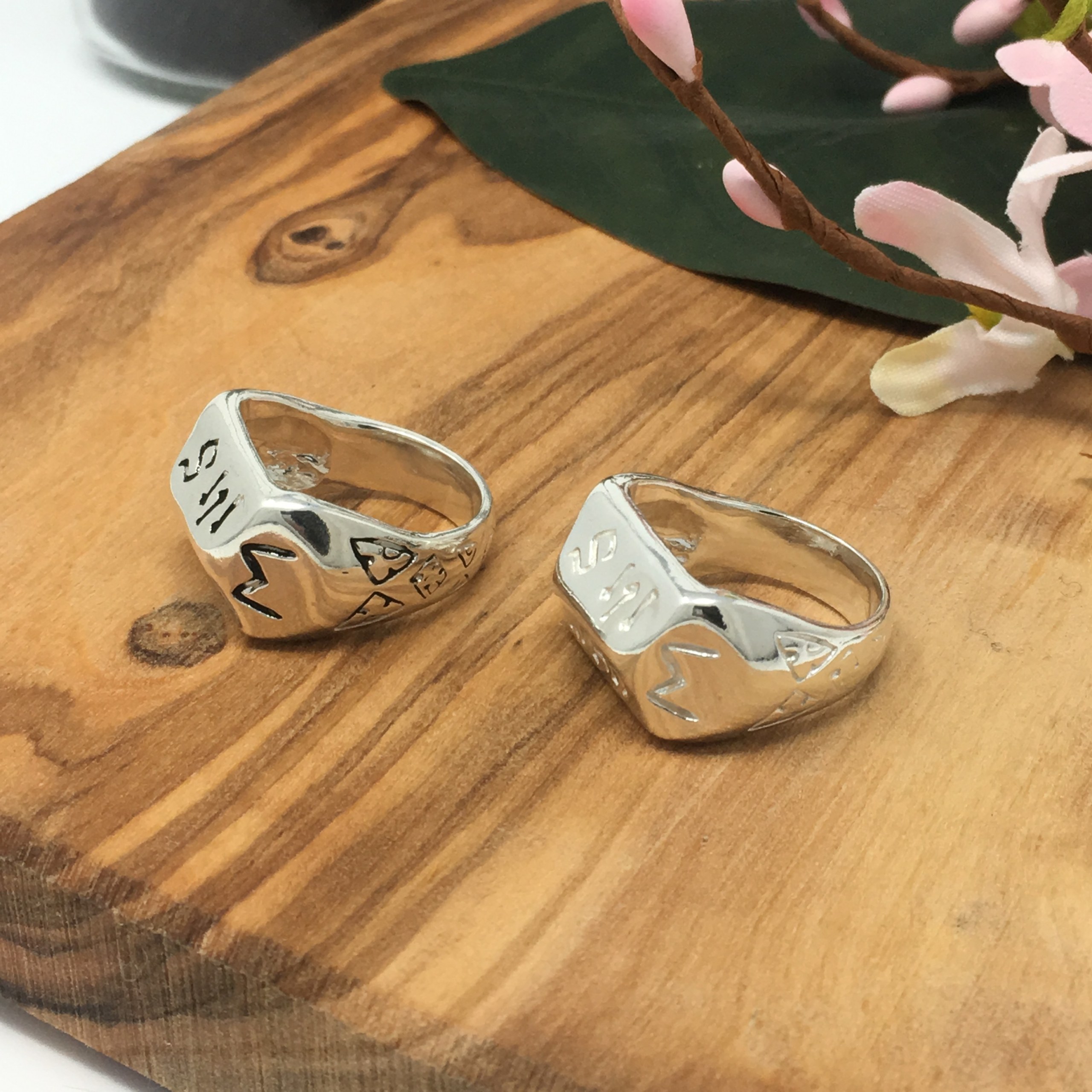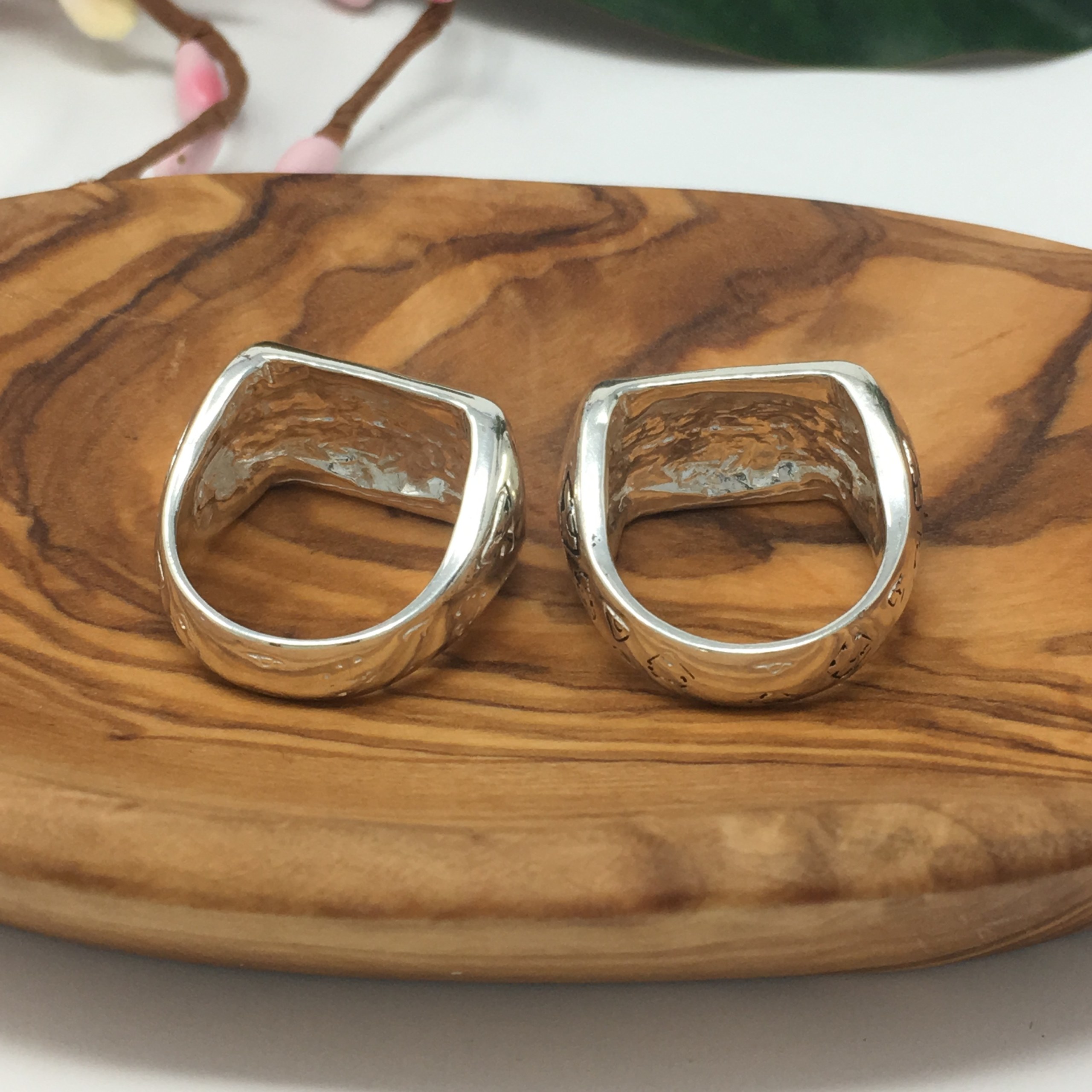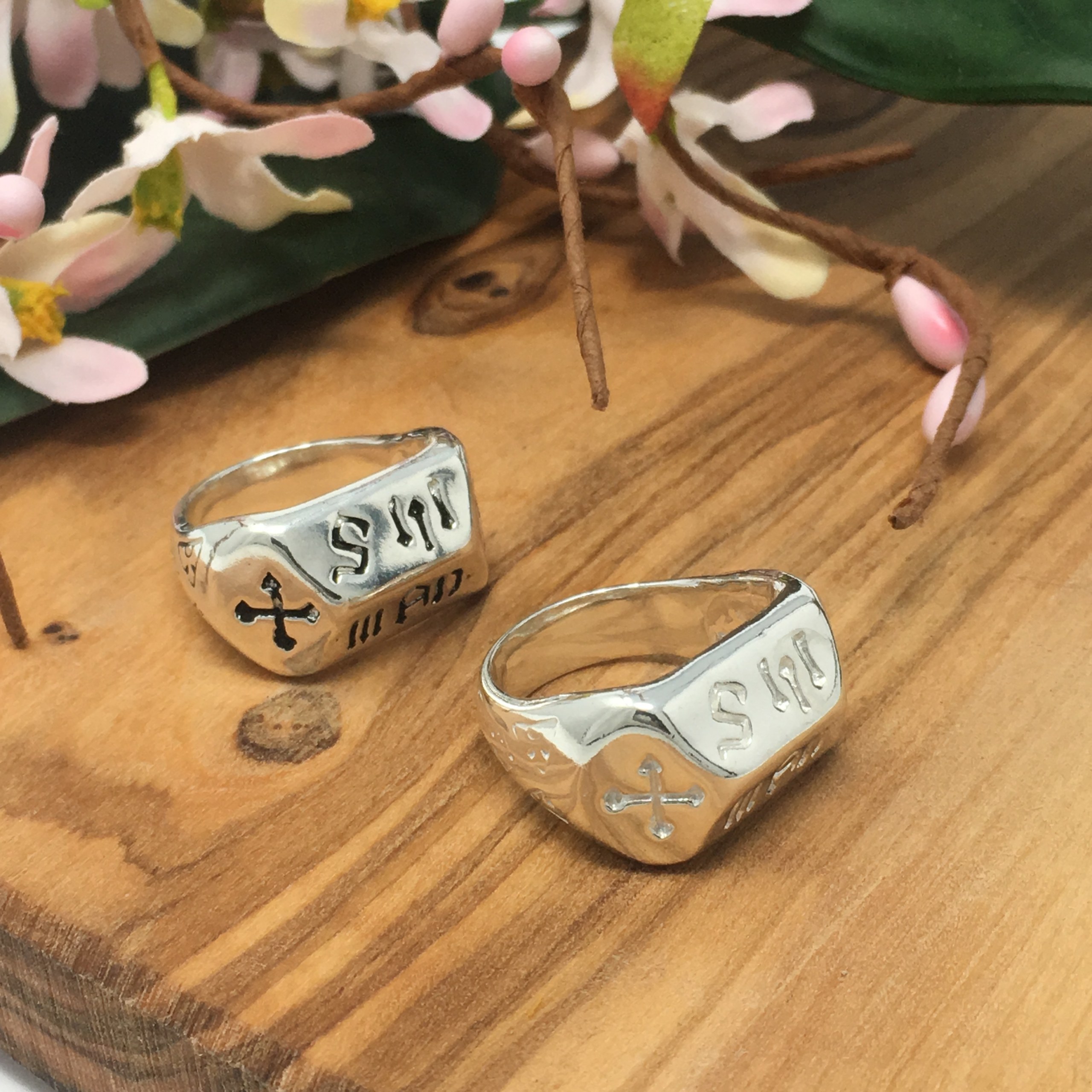 A handmade replica sterling silver reproduction of the ring given to St. Joan of Arc by her parents for her first communion. The original ring was kept by England after Joan was burned at the stake and only recently returned to France. The ring is a hefty .4 oz of silver. On the top, one side reads “I H S” (abbreviation for “Jhesus”) and “M A R” (“Maria”). Left and right side are inscribed with the letters I and M respectively. Faint decorative etchings are also visible on each side of the ring.