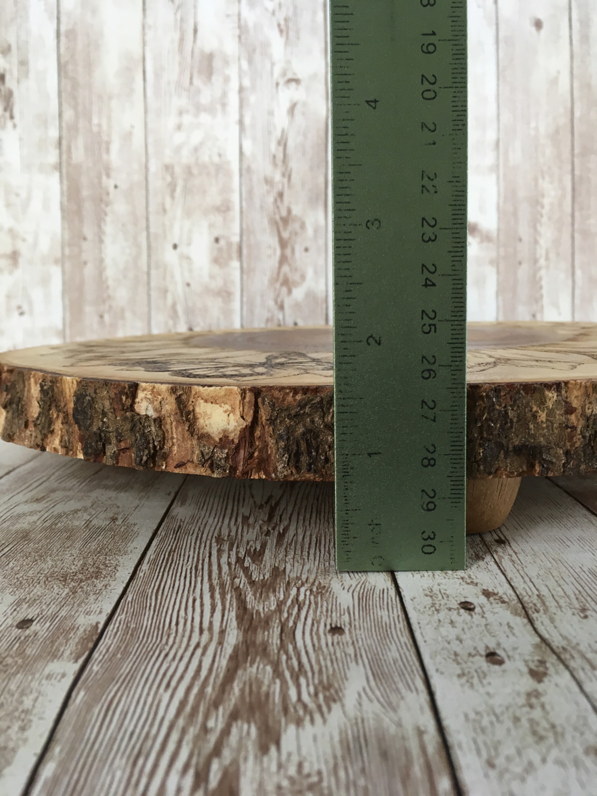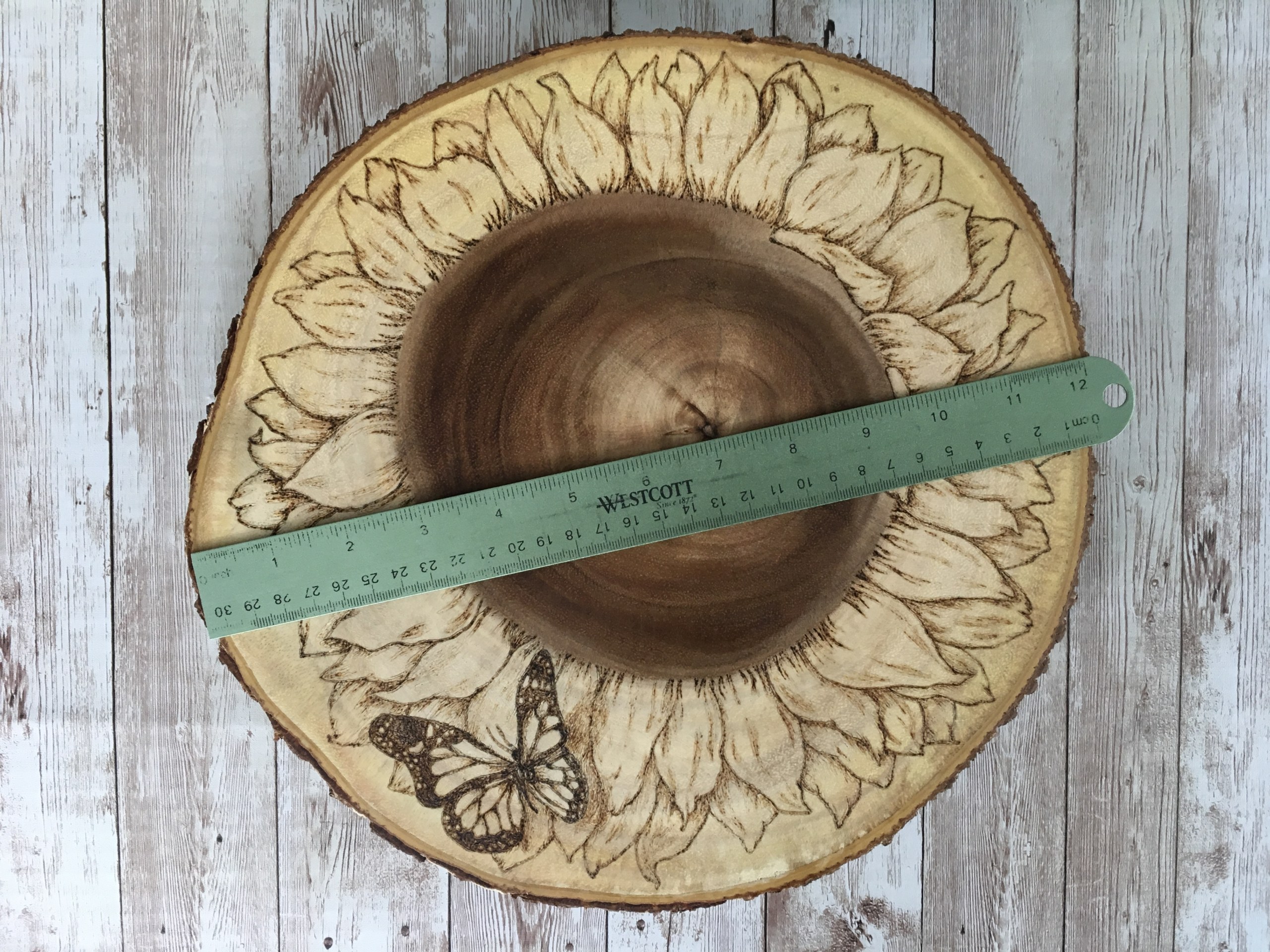 This is an original design, one-of-a-kind wood burning. It is burned on an acacia wood, bark-edged board with wooden feet and measures 12” in diameter and about 1.5” in height. Finished and ready to ship!
