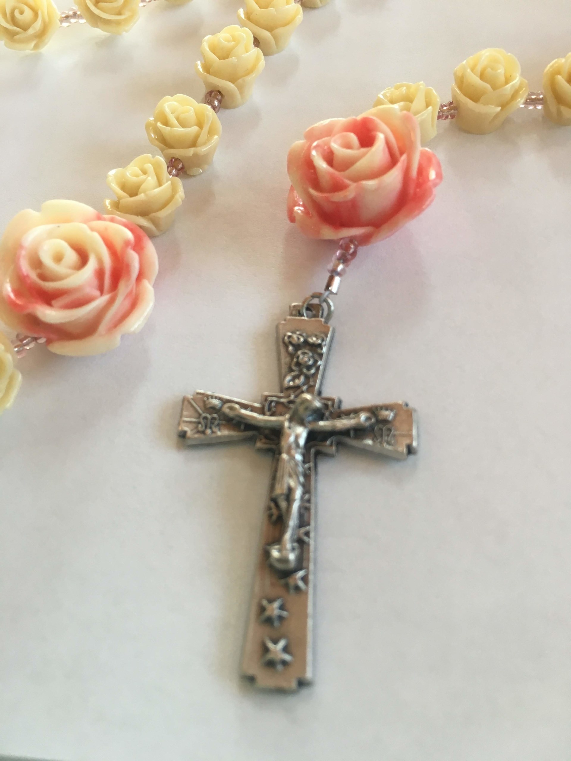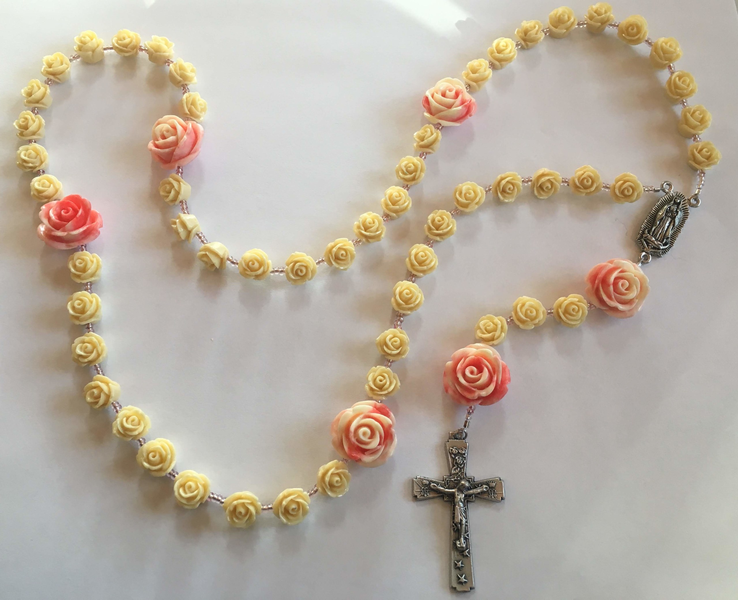 This rosary is made of acrylic cream roses and larger coral and cream roses. The centerpiece shows Our Lady’s image and reads “Our Lady of Guadalupe” on the back. It is completed with a highly detailed Marian crucifix–featuring roses, stars, crowns, and the Marian “M” symbol.