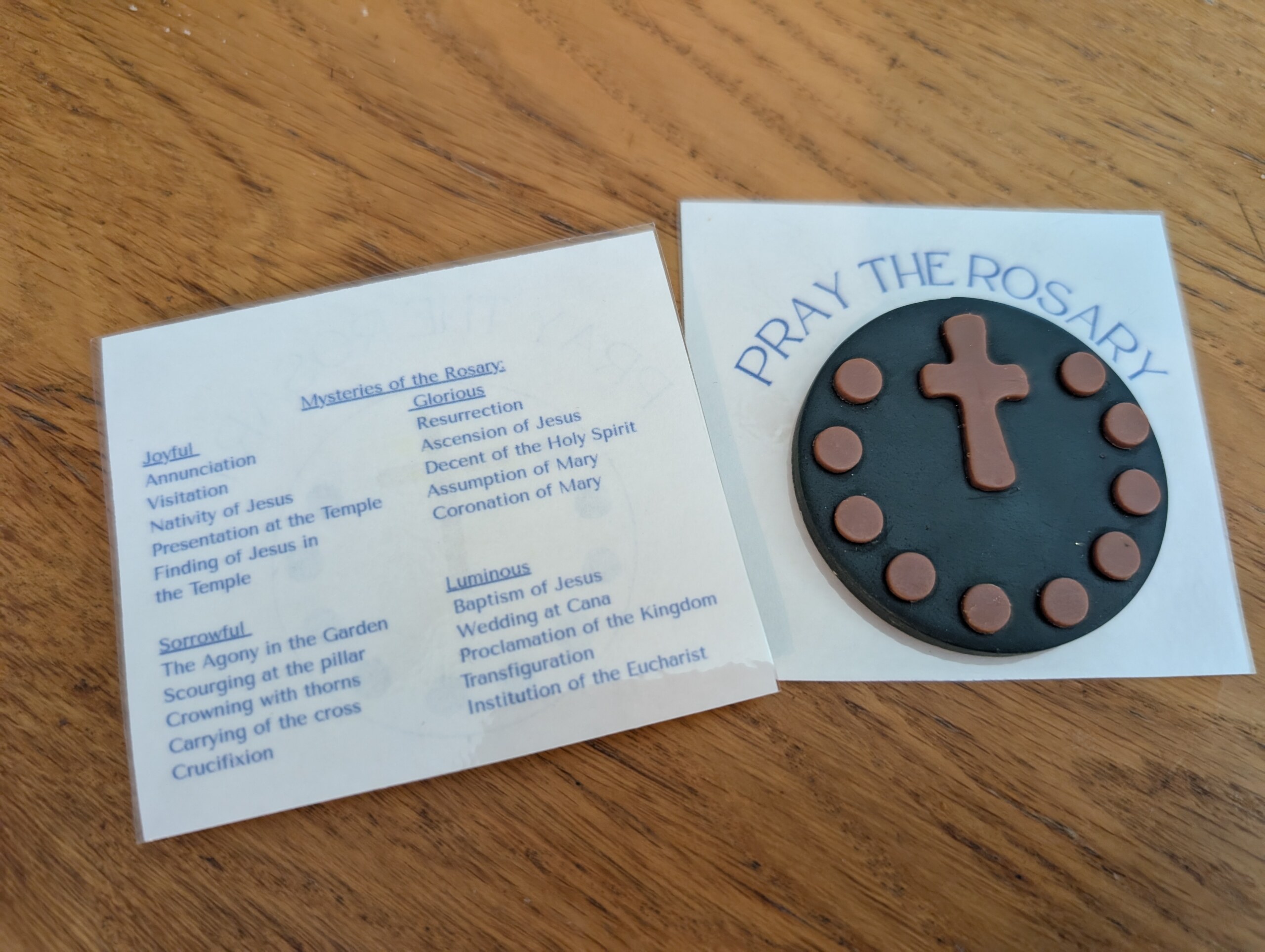 Hand made of polymer clay, these pocket rosaries are sturdy but flexible, making them difficult to break. You can fit them in your wallet, purse or pocket and always have them with you wherever you go. Never worry about chains getting tangled or links breaking. Plus, it’s a great tactile option for kids. Each rosary comes with a prayer card listing the mysteries of the rosary. May it help you to pray without ceasing.