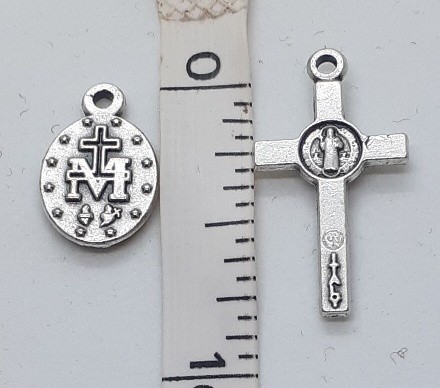 The medals are a small Miraculous medal (Miraculous Medal Measures 3/4 inch in height, intricately detailed, made in Italy with high quality medal. And a St Benedict metal crucifix that is 3/4″ tall and features a detailed St. Benedict medal, front and back. It is silver oxidized and Italian made.