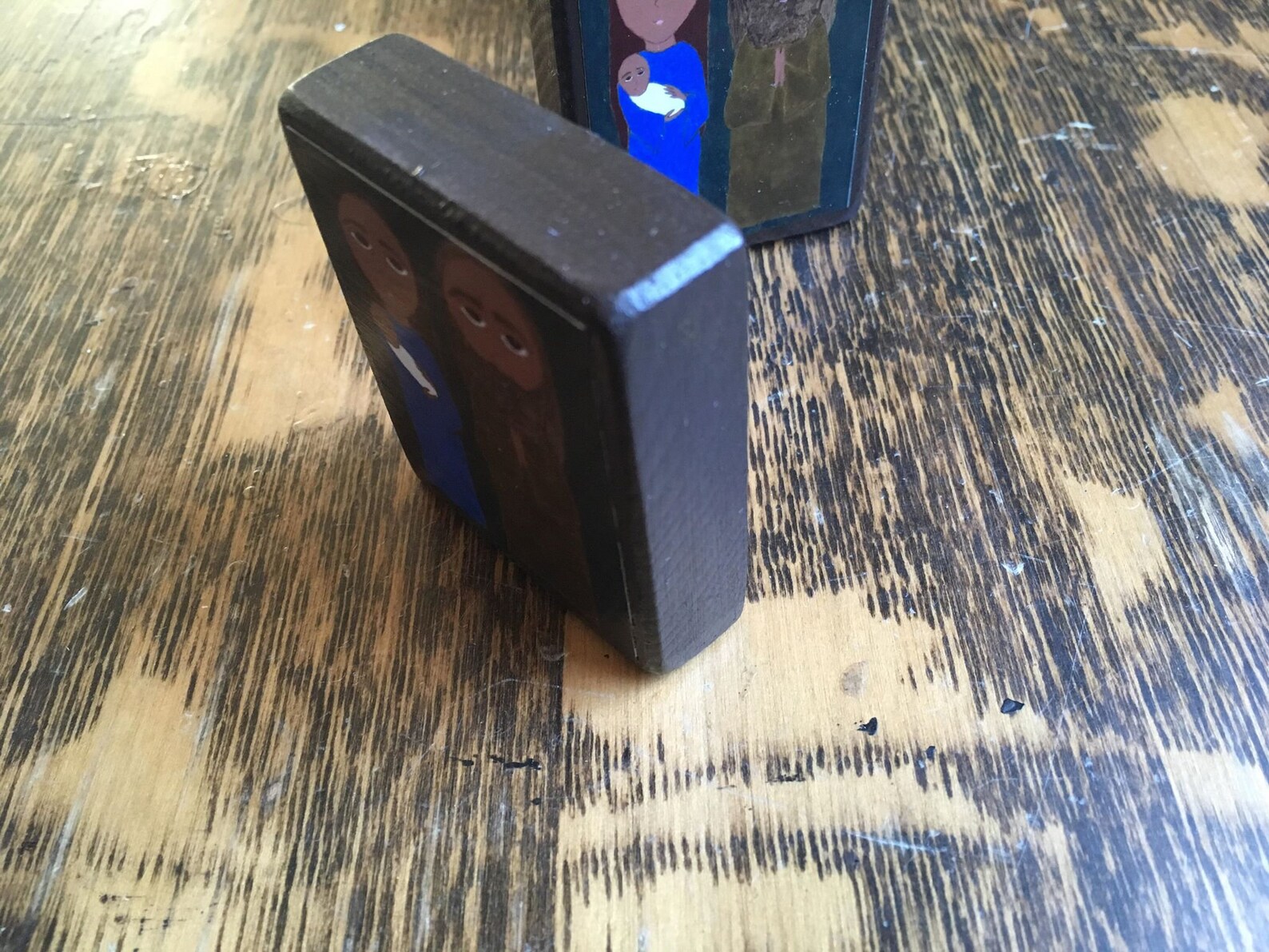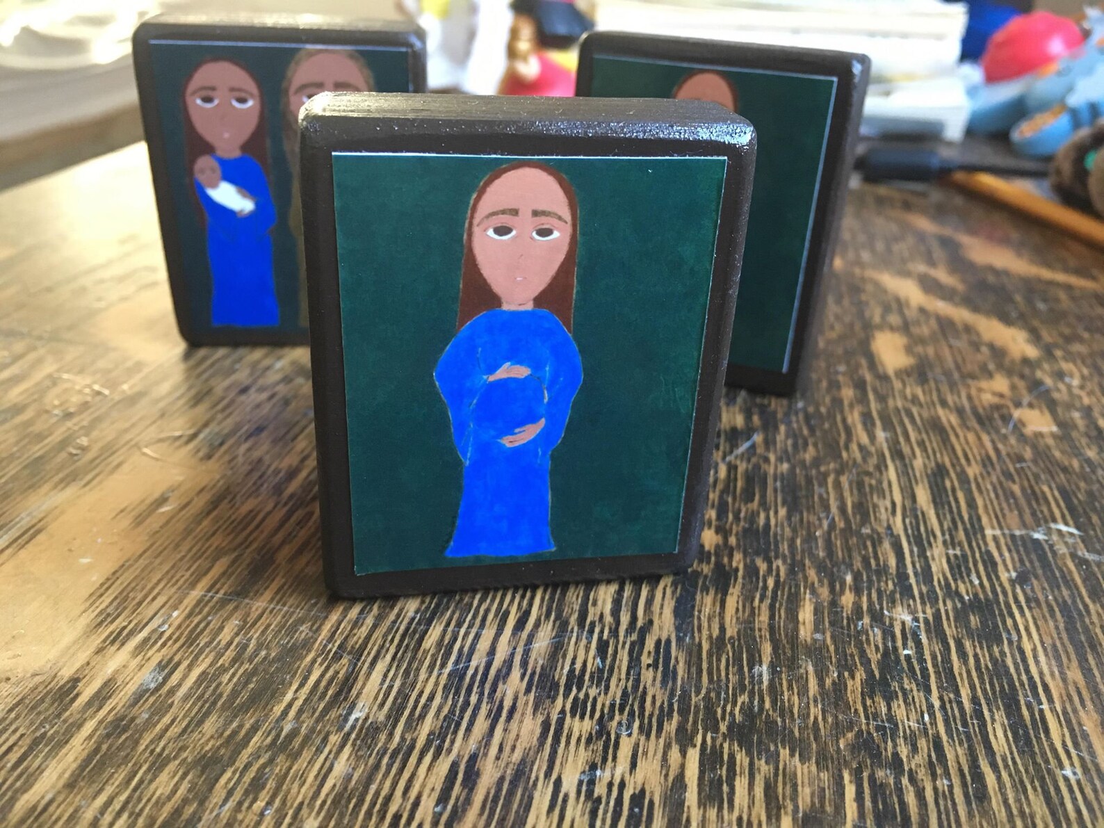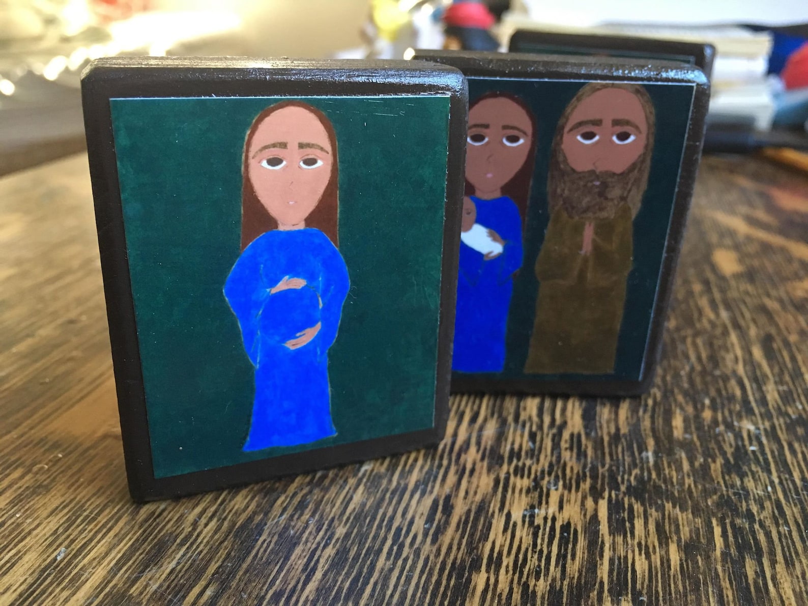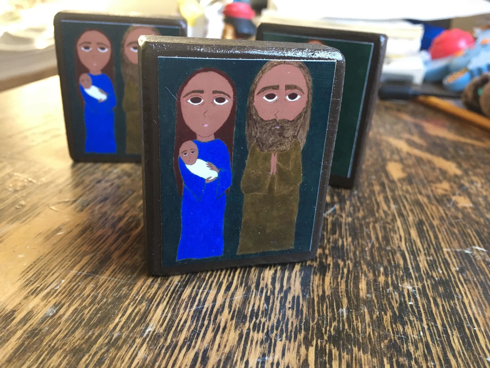 Since I’m not a statue carver, I had to make-do with what I had. I painted the images and put their prints on a 2.5 X 2 X .5-ish block of wood painted brown. Pregnant Mary is on one side of the block and the Holy Family is on the other. All during Advent, display pregnant Mary and then on Christmas Eve, just flip her around and voila! The Holy Family. The Nativity is complete and a Merry Christmas is had by all.