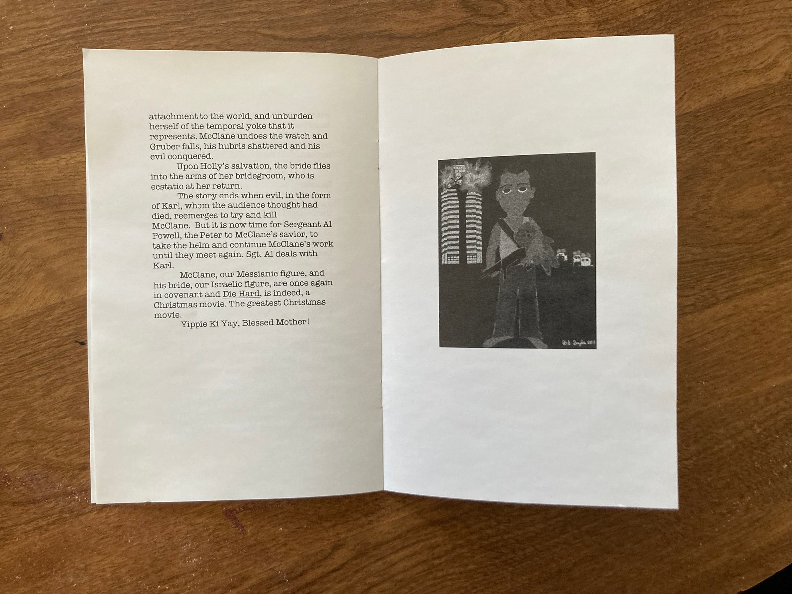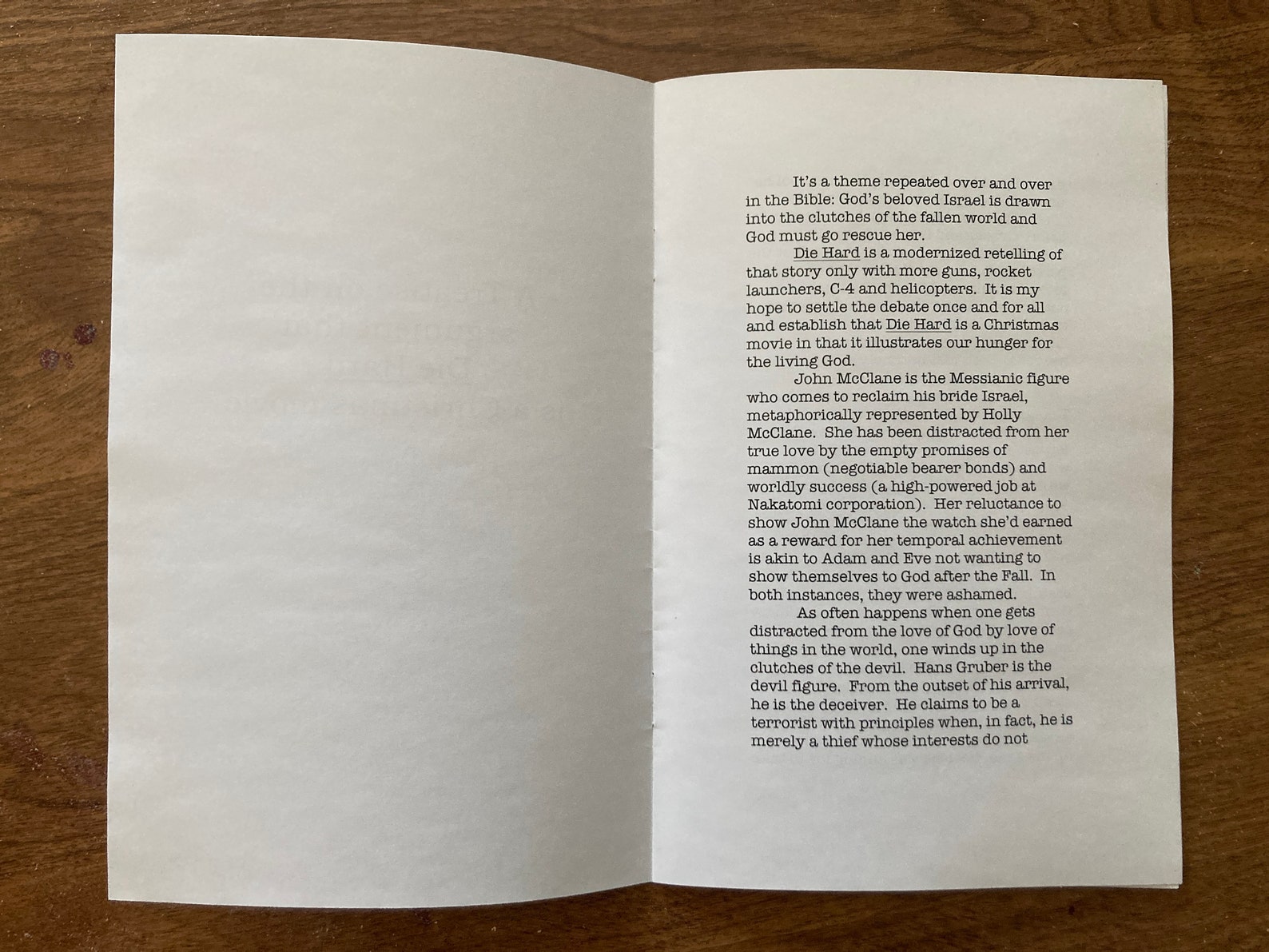 A lovely little 8 page pamphlet professionally printed and saddle stitched (fancy talk for stapling) using Biblical evidence to prove that Die Hard is a Christmas movie.