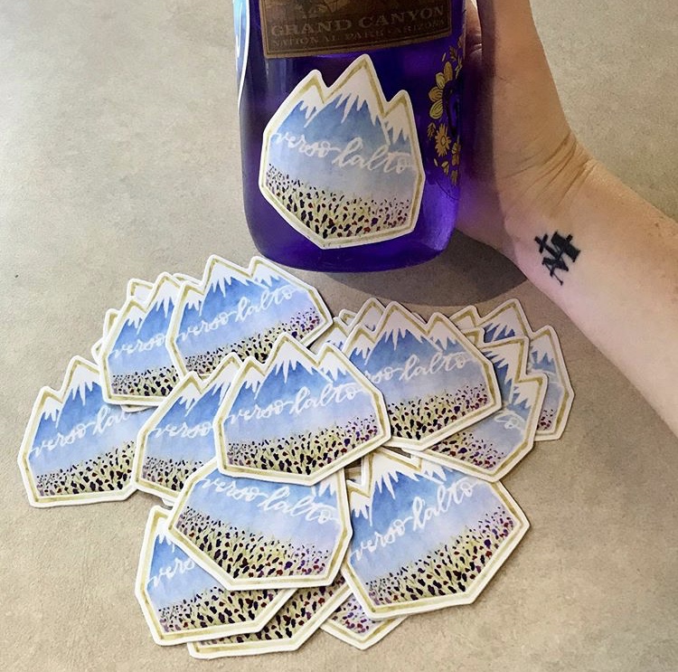 Sticker reads: “Verso l’alto.” Die-cut mountain shape measuring 3×3 inches.