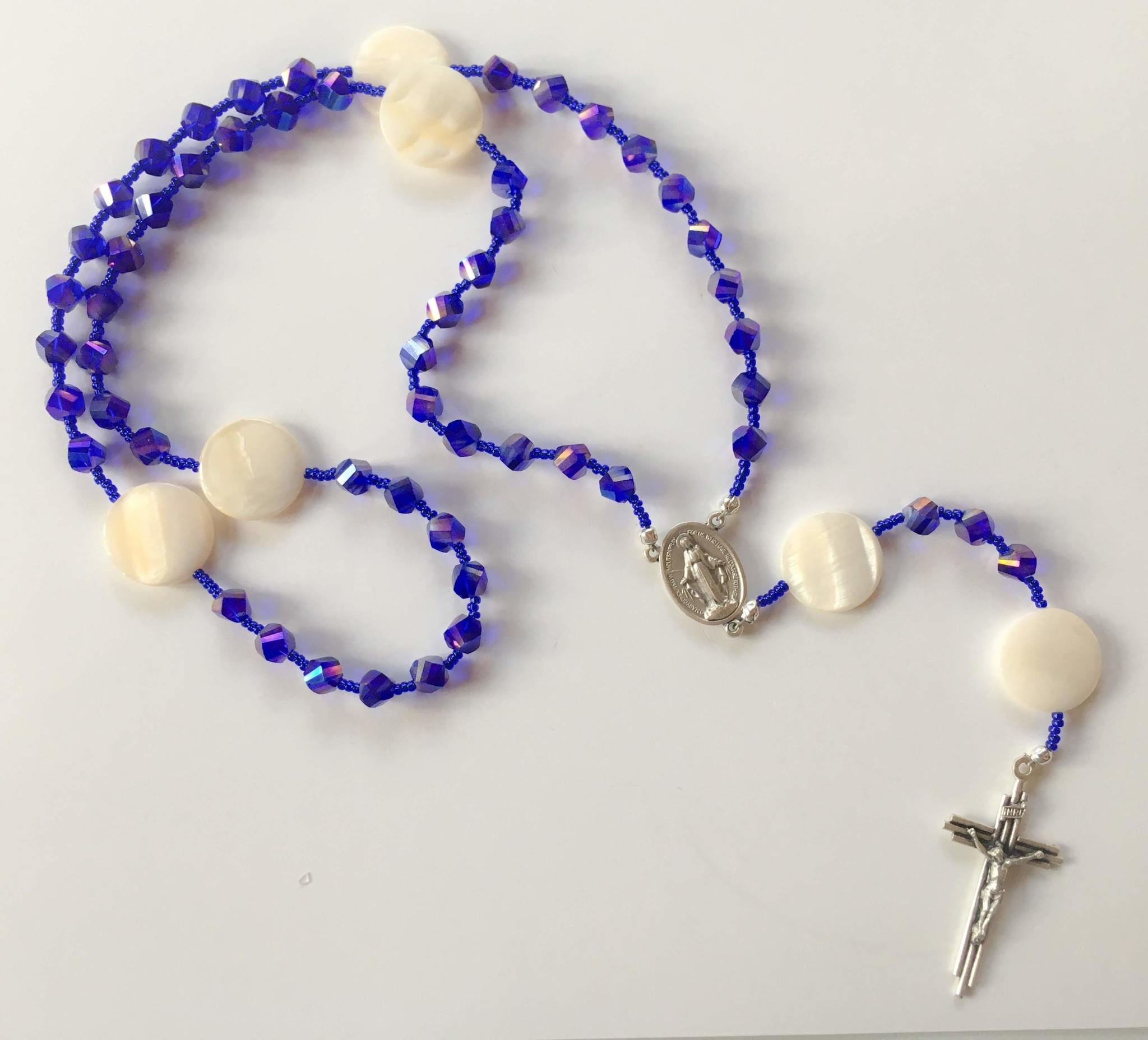 As the first in our Ave Maris Stella Collection, the Waves rosary reflects the deep beauty of the promises we are guaranteed in the prayer of the Holy Rosary. Let the deep blue faceted glass beads and the natural shell coins soothe you as bring your prayers to Our Lady, Star of the Sea.