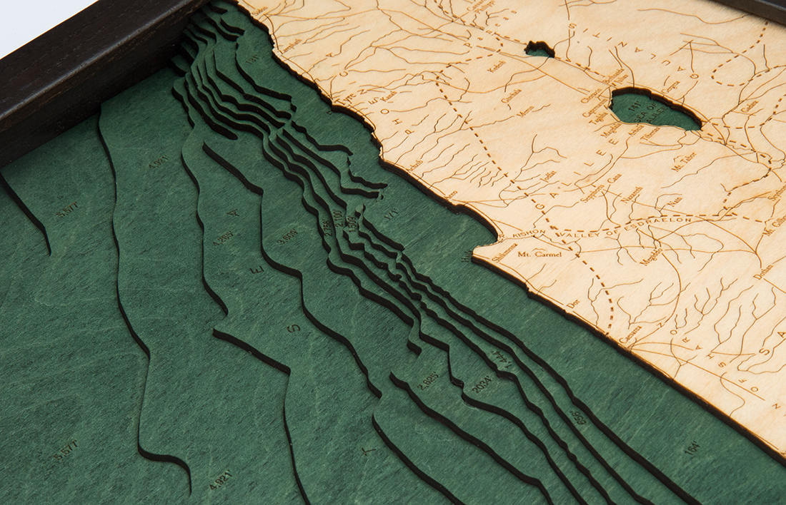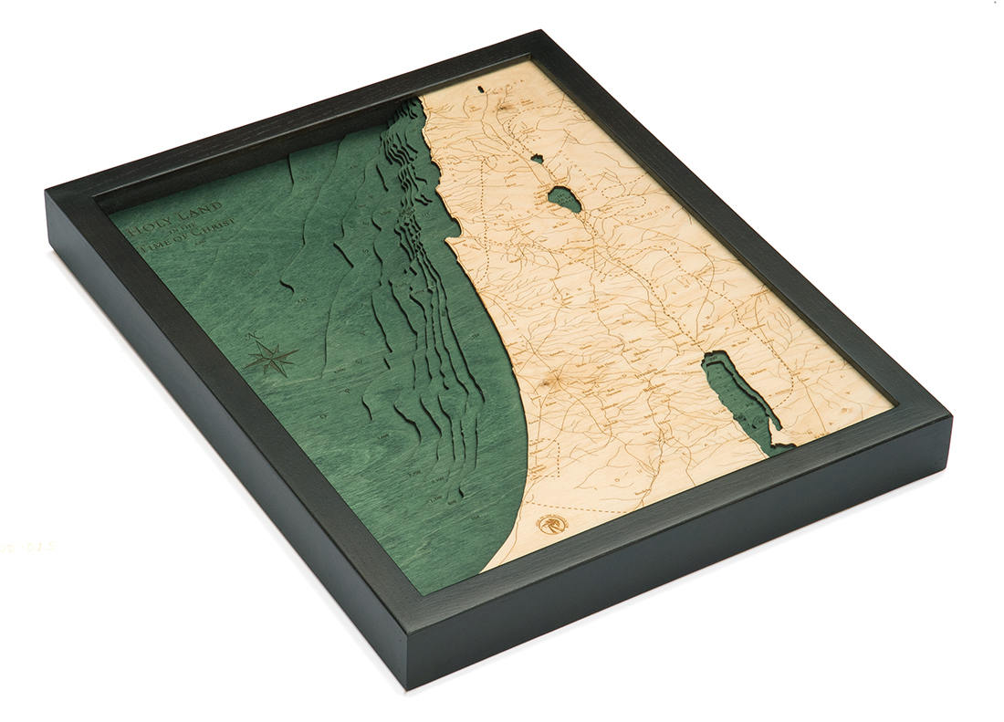 Baltic Birch engraved 11 layer map of the Holy Land with a mocha solid wood frame. A high level of detail is etched into the wood showing towns, creeks & ancient roads. Water details are layered to give dimension to this truly unique artwork. A great reference and conversation piece that will add to any home, office or classroom. They come framed with plexiglass and are ready to hang. All of the profits get donated to our local parish school here in Charlevoix Michigan.