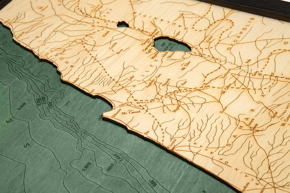 Baltic Birch engraved single layer map of the Holy Land with a mocha solid wood frame (no glass cover). A high level of detail is etched into the wood showing towns, creeks & ancient roads. Water details are on a separate layer to give dimension to this truly unique artwork. A great reference and conversation piece that will add to any home, office or classroom. They come framed and ready to hang. All of the profits get donated to our local parish school here in Charlevoix Michigan.
