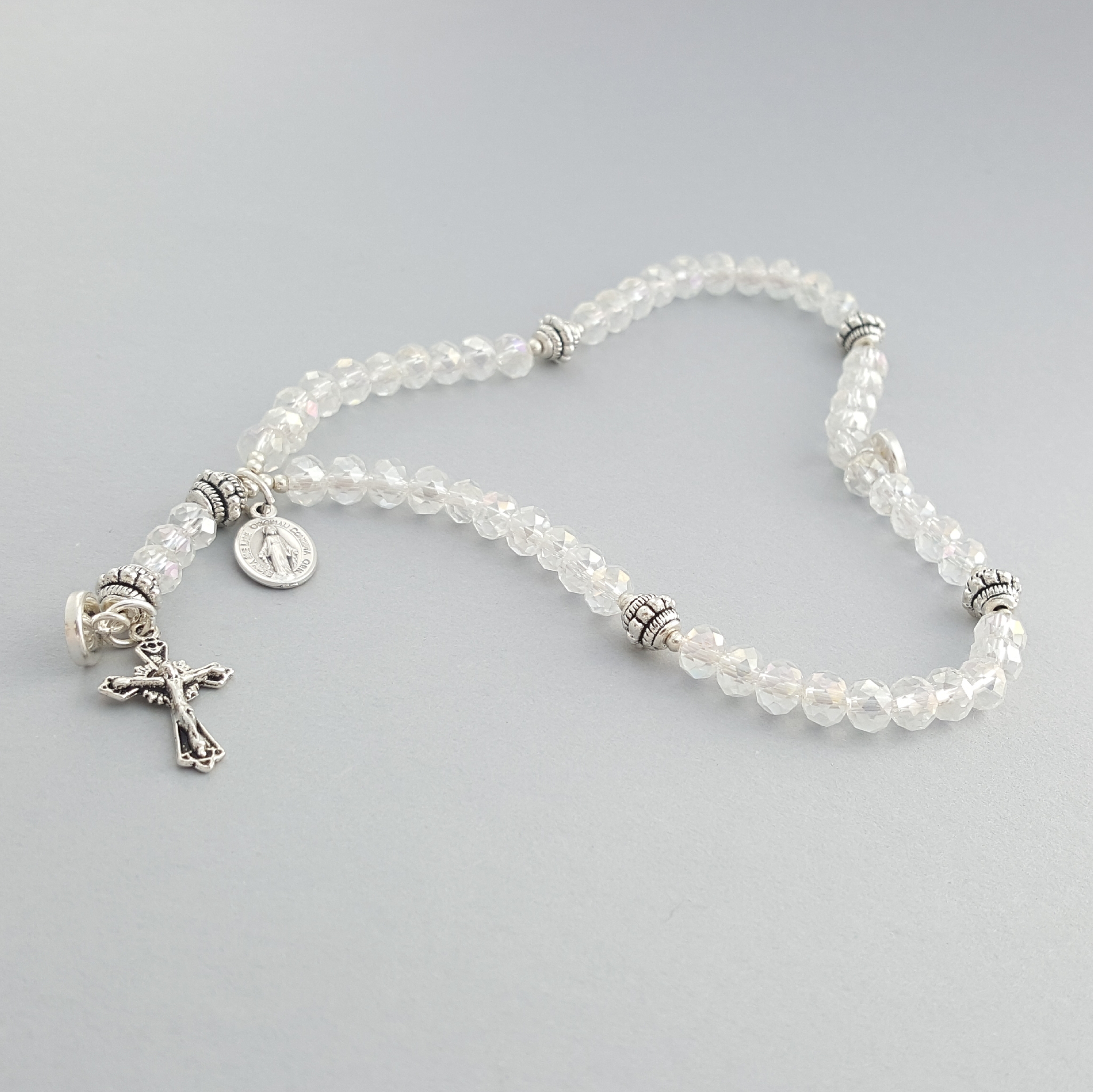 The Wrist Rosary is the original design of MG Rosary, a tiny, complete 5 decade rosary that has a magnetic clasp in the center of the third decade so it can be worn as a bracelet and easy to remove for prayer. The strong magnet will not come open on its own, the tension must be broken with a fingernail or it must be slid apart.