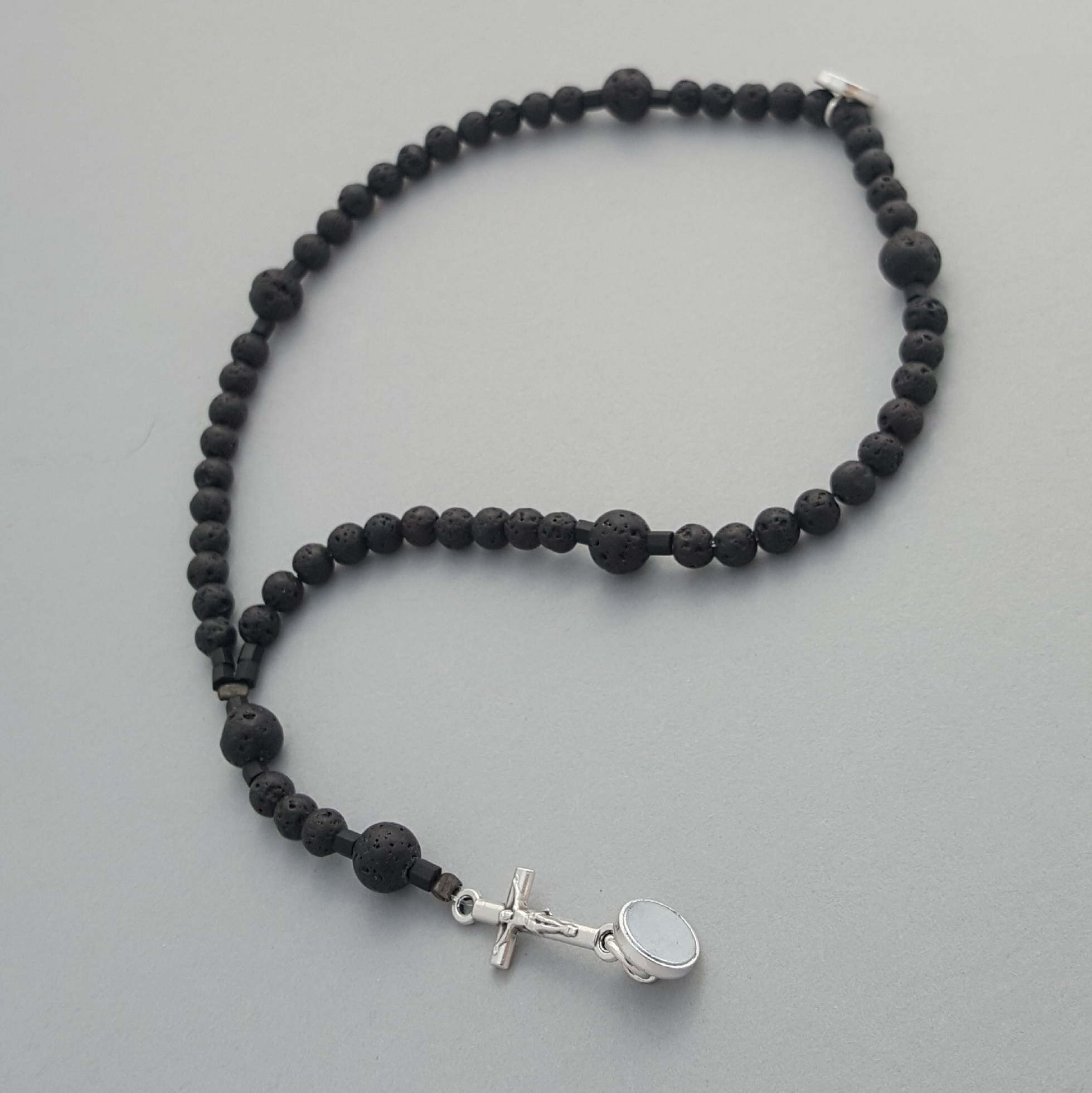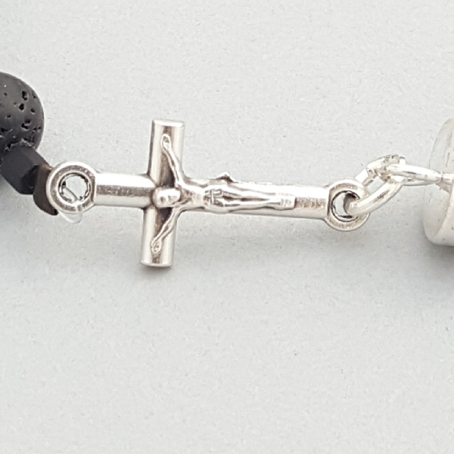 This model is specifically designed and sized for men, though ladies like it, too. Natural lava rock with a sideways crucifix. Nothing dangling here!
